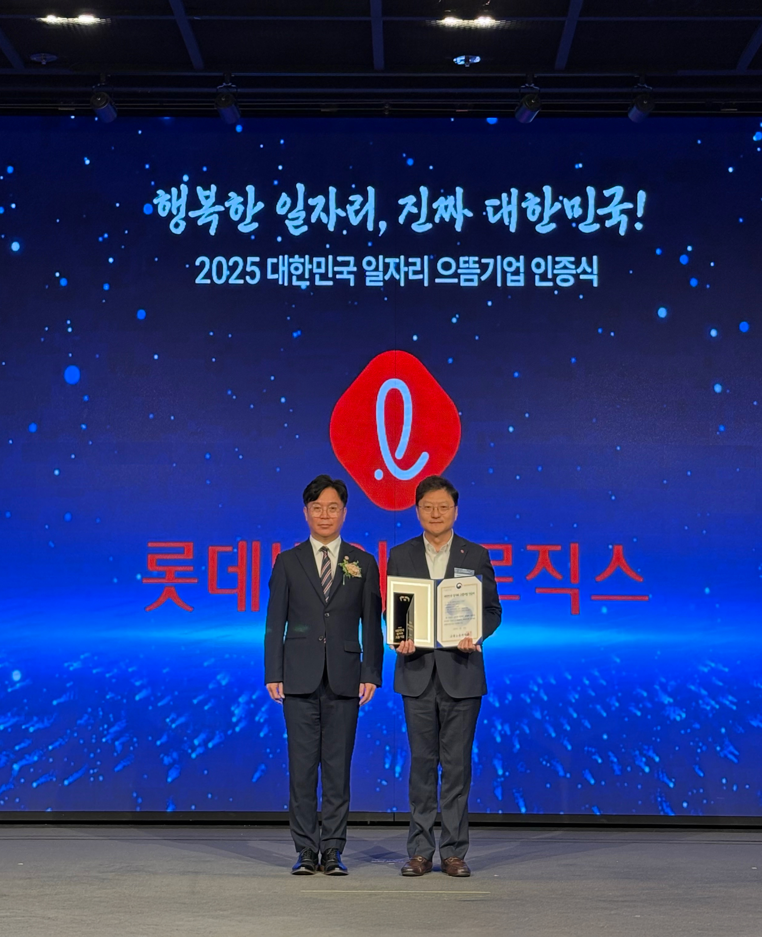 ▲Kim Young hoon, Minister of Employment and Labor (left), and Taehyung Lim, Executive Director of LOTTE BIOLOGICS, during the ceremony for the 2025 Best Job-Creating Company (MOEL Certaification).